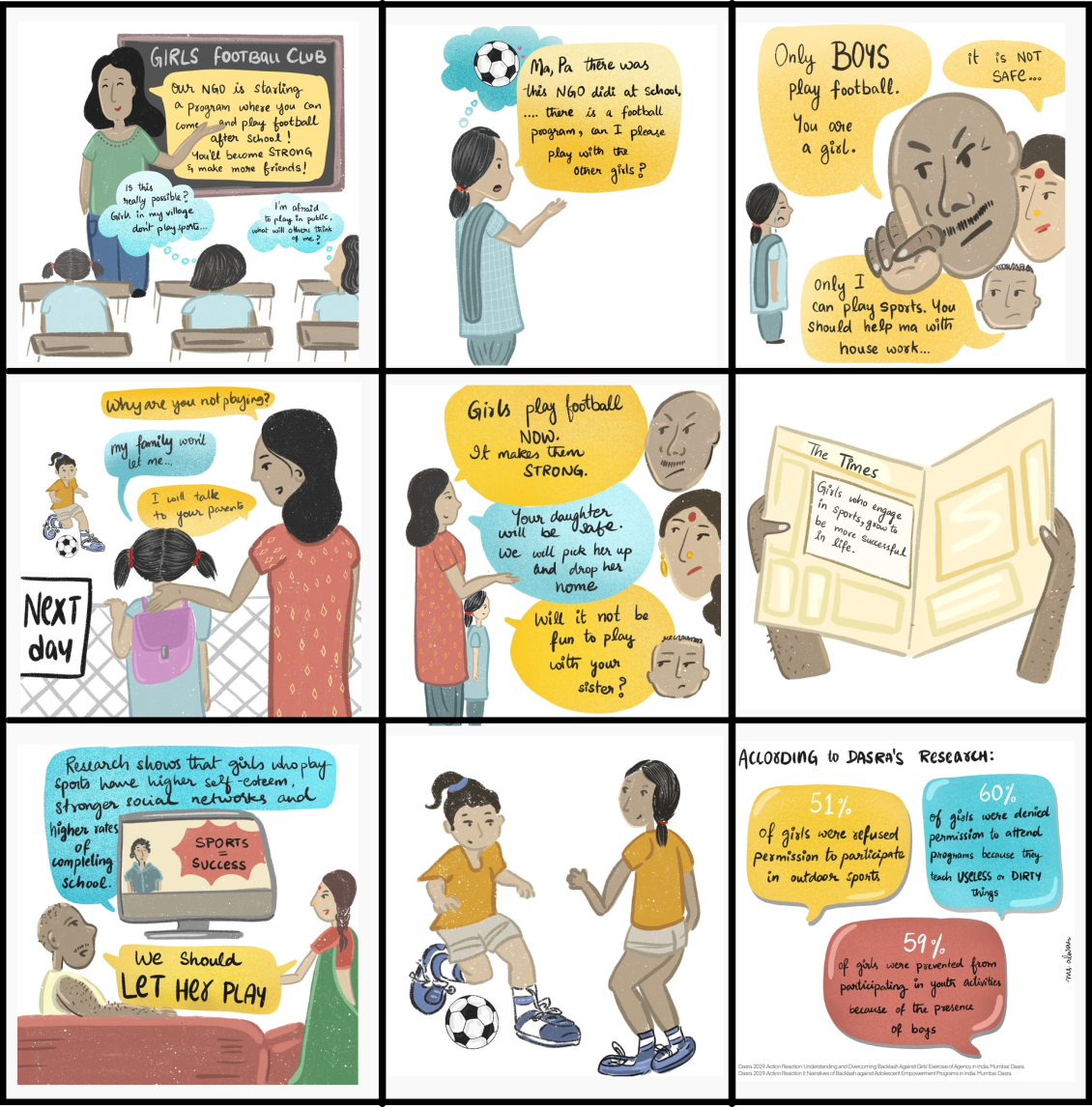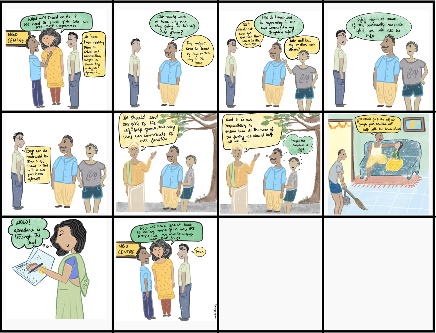 The design intends to translate complex social issues into visually compelling, hand-drawn narratives, using a crayon-textured style that reflects the raw, unfinished nature of progress. In collaboration with Dasra, a pioneering organization that accelerates social change through strategic philanthropy, three 9-panel comics were created to highlight critical gender justice themes: