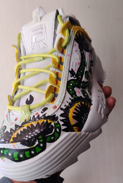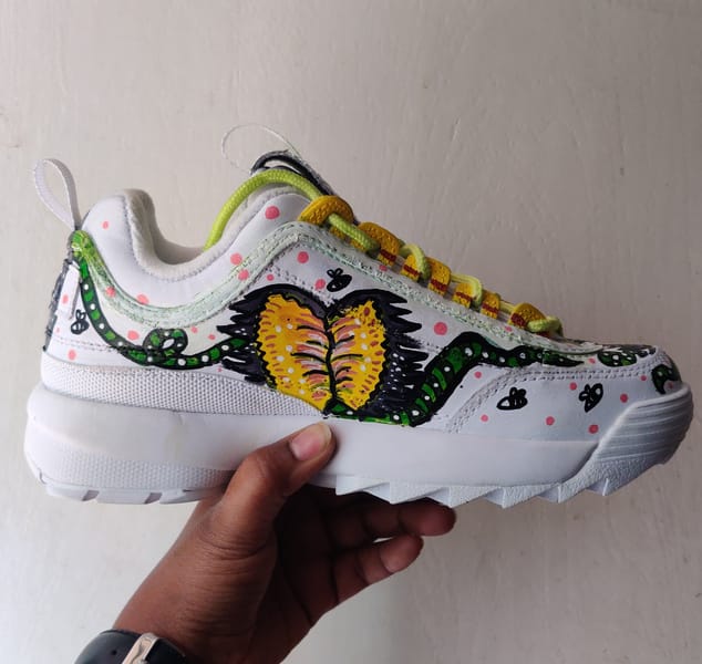 The design intends to embody a force that is both inviting and untamed, an assertion of identity that refuses to be consumed. Inspired by the Venus flytrap, the sneaker pulses with movement, its tendrils stretching and curling around the shoe, poised between allure and defense. The plant itself is deceptive, drawing in, waiting, responding. A reminder that power often lies in patience, in the ability to choose when to close in and when to remain open.
